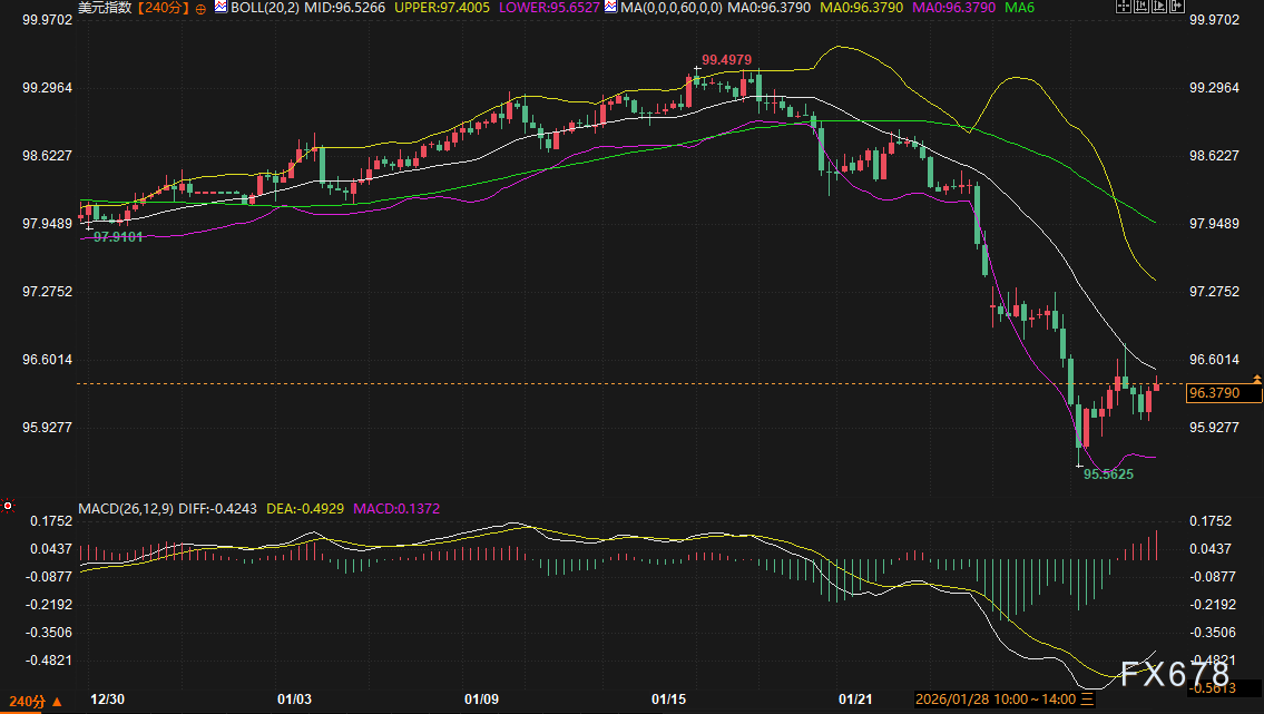 这一曲线陡峭化(即长端利率相对上升或短端利率相对下降)的过程,通常反映了市场对长期通胀或经济增长预期的重新定价,或是对于未来国债供应压力的担忧。从具体点位看,5年期收益率一度触及3.88%的近期新高,上方关键阻力在3.90%-3.93%区域;而30年期收益率则在4.90%附近遭遇压制。收益率的上升,尤其是长端,理论上应对外币投资者构成一定吸引力,但当前的市场行为却显示,这并未转化为对美元的强劲需求。相反,分析认为,美元的下跌能在贸易环境中降低美国出口成本并刺激经济,某种程度上符合政策目标。因此,美债收益率的稳健与美元的走弱并存,揭示了当前市场的核心矛盾:对美元资产的信心仍在,但对美元汇率的偏好下降。 MH官网:从技术面看,美元指数240分钟图已跌破96.3656的关键支撑,布林带向下开口,价格运行于中轨(96.5259)下方,MACD于零轴下方运行,表明短期空头趋势明确。盘中需密切关注能否重新站稳96.40-96.60区域,若持续承压于此区域下方,下一支撑将看向95.50-95.80区间。