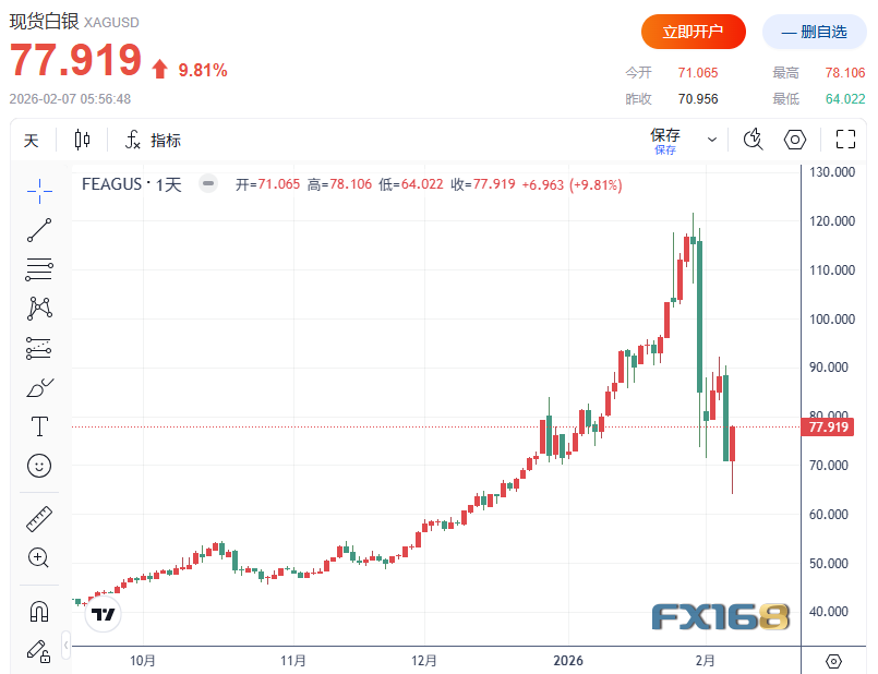 白银波动更为夸张。周四白银录得约27.8%的盘中振幅,远高于过去六年里“正常交易日”通常略高于2%的波动幅度。现货银同样未能守住90美元上方,尽管周五早盘一度承压,但美市尾盘回升至77.919美元,日内涨9.81%。不过,白银本周仍累计下跌8.29%。