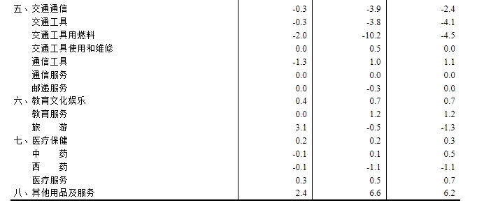 其他七大类价格同比六涨一降。其中,其他用品及服务、衣着、教育文化娱乐价格分别上涨6.6%、1.3%和0.7%,生活用品及服务、医疗保健、居住价格分别上涨0.2%、0.2%和0.1%;交通通信价格下降3.9%。