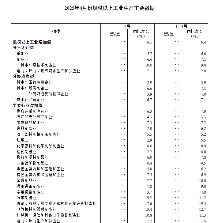 4月份,规模以上工业增加值同比实际增长6.1%(增加值增速均为扣除价格因素的实际增长率)。从环比看,4月份,规模以上工业增加值比上月增长0.22%。1—4月份,规模以上工业增加值同比增长6.4%。