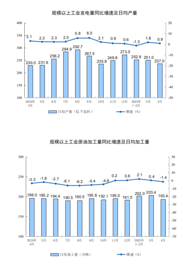 分产品看,4月份,规模以上工业623种产品中有341种产品产量同比增长。其中,钢材12509万吨,同比增长6.6%;水泥16530万吨,下降5.3%;十种有色金属676万吨,增长3.1%;乙烯298万吨,增长10.1%;汽车260.4万辆,增长8.5%,其中新能源汽车122.8万辆,增长38.9%;发电量7111亿千瓦时,增长0.9%;原油加工量5803万吨,下降1.4%。