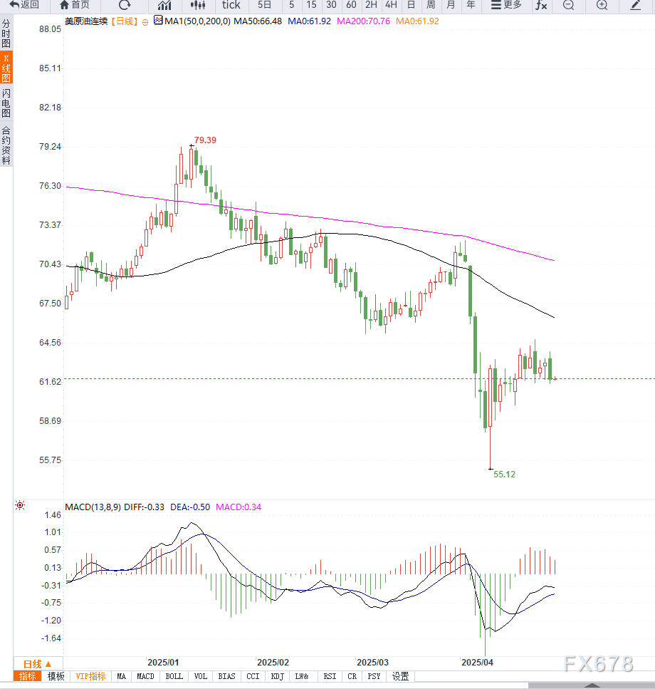 从日线级别走势来看,WTI原油自65美元附近回落,目前已跌破重要支撑位62美元,整体趋势偏空。短期内5日、10日均线形成死叉,并持续压制油价下行,20日均线拐头向下,中期弱势格局显现。