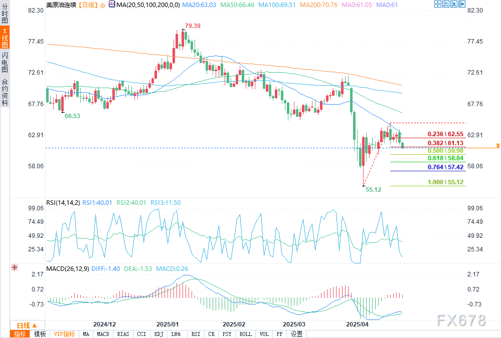 原先的乐观情绪被贸易摩擦可能升级的担忧所取代,这种不确定性日益增加,交易员们因此抛售了石油合约。贸易摩擦的升级将进一步损害全球石油需求前景。   石油输出国组织(OPEC)最新决定从6月起进一步增加石油产量,这又增加了负面因素,使交易员们采取防御策略。   技术分析   油价从四年低点55.12美元(4月9日的低点)反弹后,再次尝试上涨但均告失败,在72.27美元至55.12美元下跌波段的50%回撤位区域遭到反复打压,并跌破了55.12美元至64.85美元反弹波段的38.2%斐波那契回撤位(61.13美元)。   这产生了新的看跌信号(若要确认该信号,需日线收于该水平下方),并强化了短期看跌前景,因为空头将目标瞄准在60.00美元(心理关口/50%回撤位)。   若价格有效跌破60美元,将使短期形势转为负面,并表明修正阶段结束。
