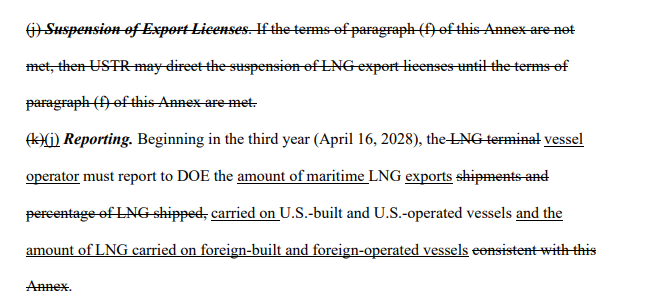 在拟议的修改中,美国贸易代表办公室已经删除了关于未满足规定的处罚措施,但仍保留了运营商报告非美国船舶占比的报告义务。