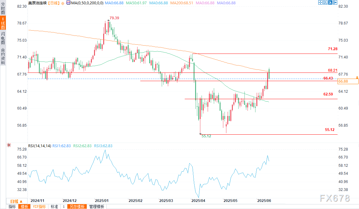 周四(6月12日)欧盘时段,原油期货大幅下跌,交易员在关键地缘政治事件前获利了结并重新评估风险,抹去了早前的涨幅。西得克萨斯中质原油(WTI)在早盘交易中飙升至69.29美元,但随后大幅逆转,可能形成收盘价格反转顶部,这一技术警告信号表明近期可能出现回调。
