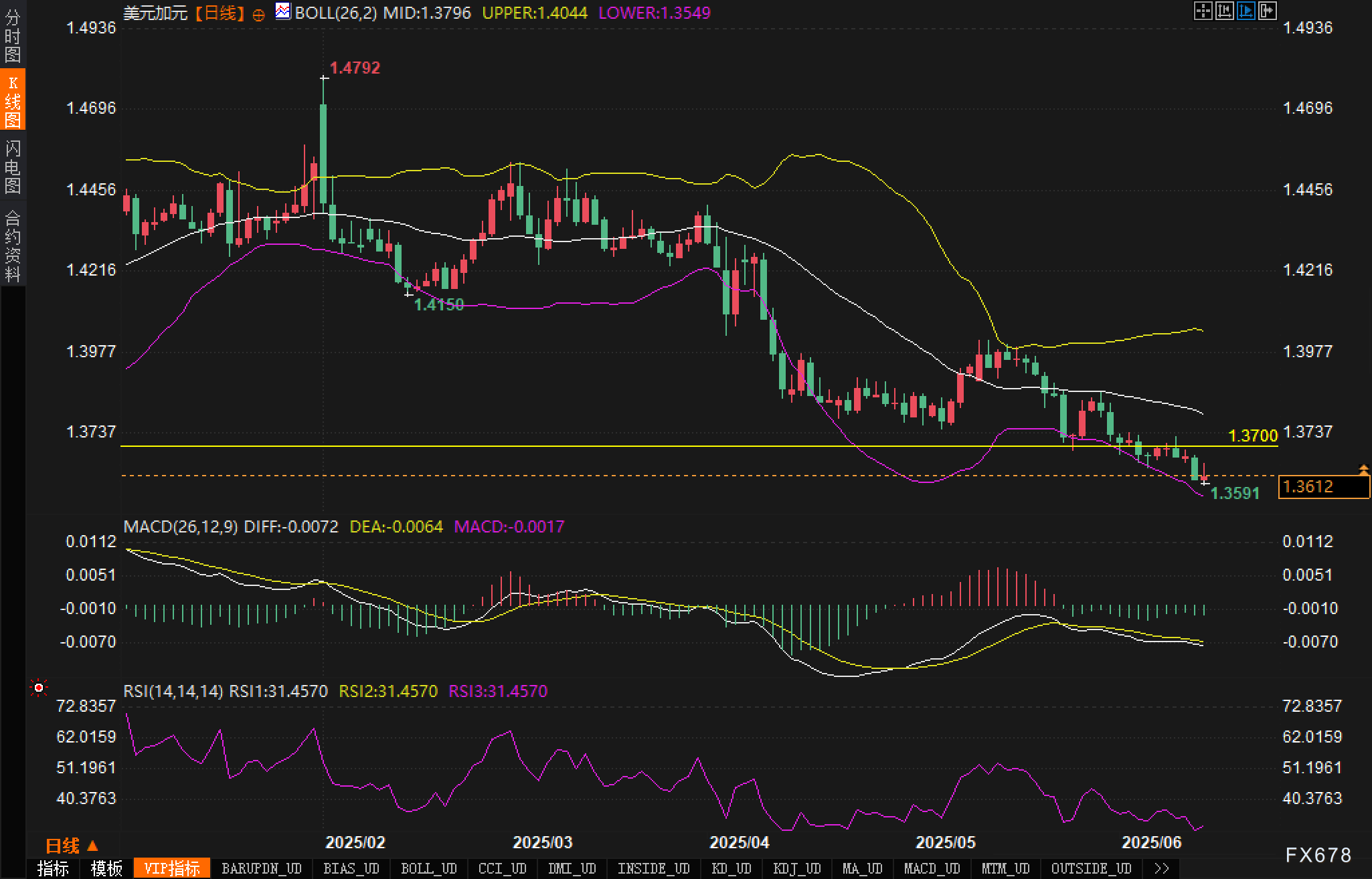 汇价目前运行于布林带下轨附近,整体位于布林中轨(1.3796)及下轨(1.3549)之间,并已多日未能有效重返中轨上方。低点1.3591构成短期关键支撑区域,该位一旦跌破,将打开下行至1.3549甚至1.3500的空间。