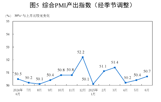 6月份,综合PMI产出指数为50.7%,比上月上升0.3个百分点,表明我国企业生产经营活动总体扩张有所加快。