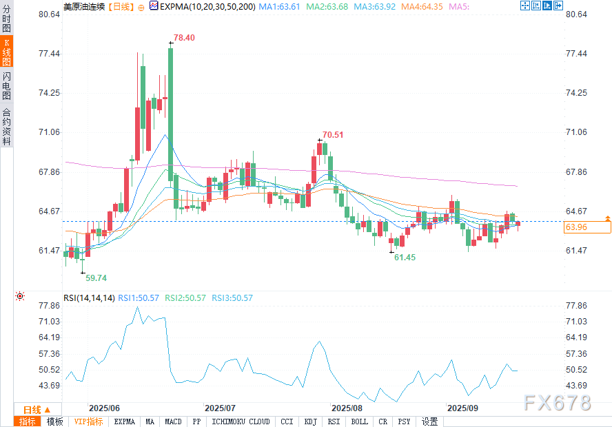 周四(9月18日),WTI原油期货承压下行,向狭窄交易区间的低端滑落,交易员正消化美联储最新降息举措。价格波动受限于50日移动平均线(64.35美元)构成的阻力位与20日移动平均线(63.69美元)构成的支撑位之间,暂无明确突破迹象。