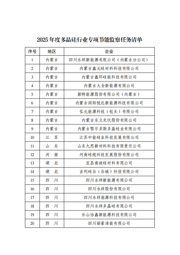 工业和信息化部办公厅关于印发2025年度多晶硅行业专项节能监察任务清单的通知 工信厅节...