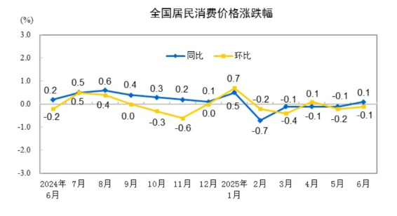 2025年6月份居民消费价格同比上涨0.1% 2025年6月份,全国居民消费价格同比上...
