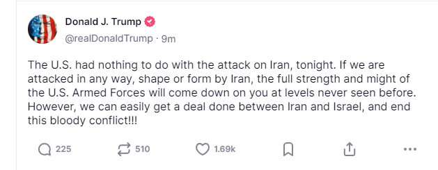 美东时间15日凌晨,美国总统特朗普在社交平台上称,“美国与伊朗今晚遭袭事件无关”,并...